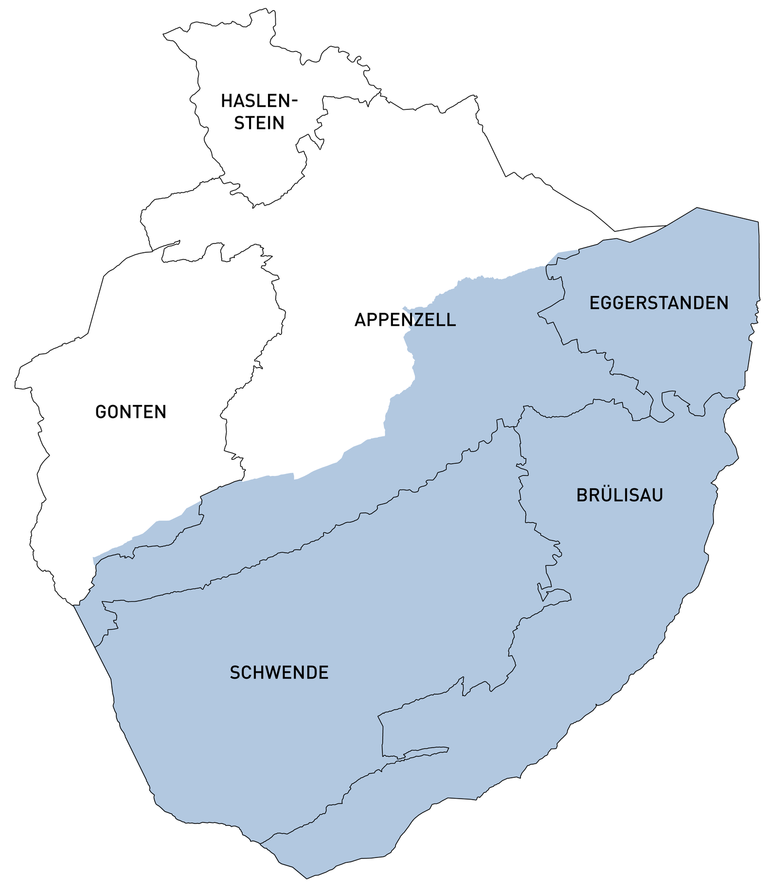 Katholische Kirchgemeinden im inneren Landesteil des Kantons Appenzell I.Rh., blau hinterlegt das Gebiet des Bezirks Schwende-Rüte