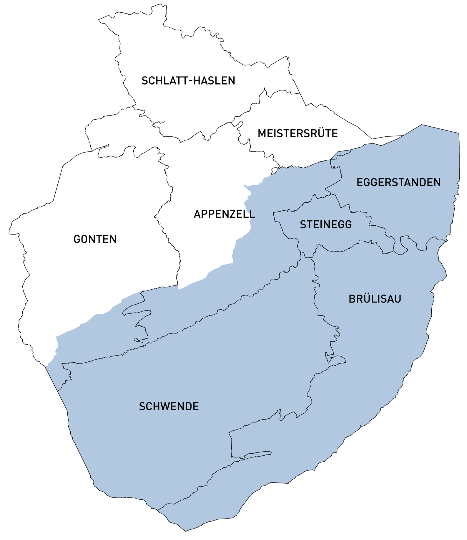 Schulgemeinden im inneren Landesteil des Kantons Appenzell I.Rh., blau hinterlegt das Gebiet des Bezirks Schwende-Rüte.