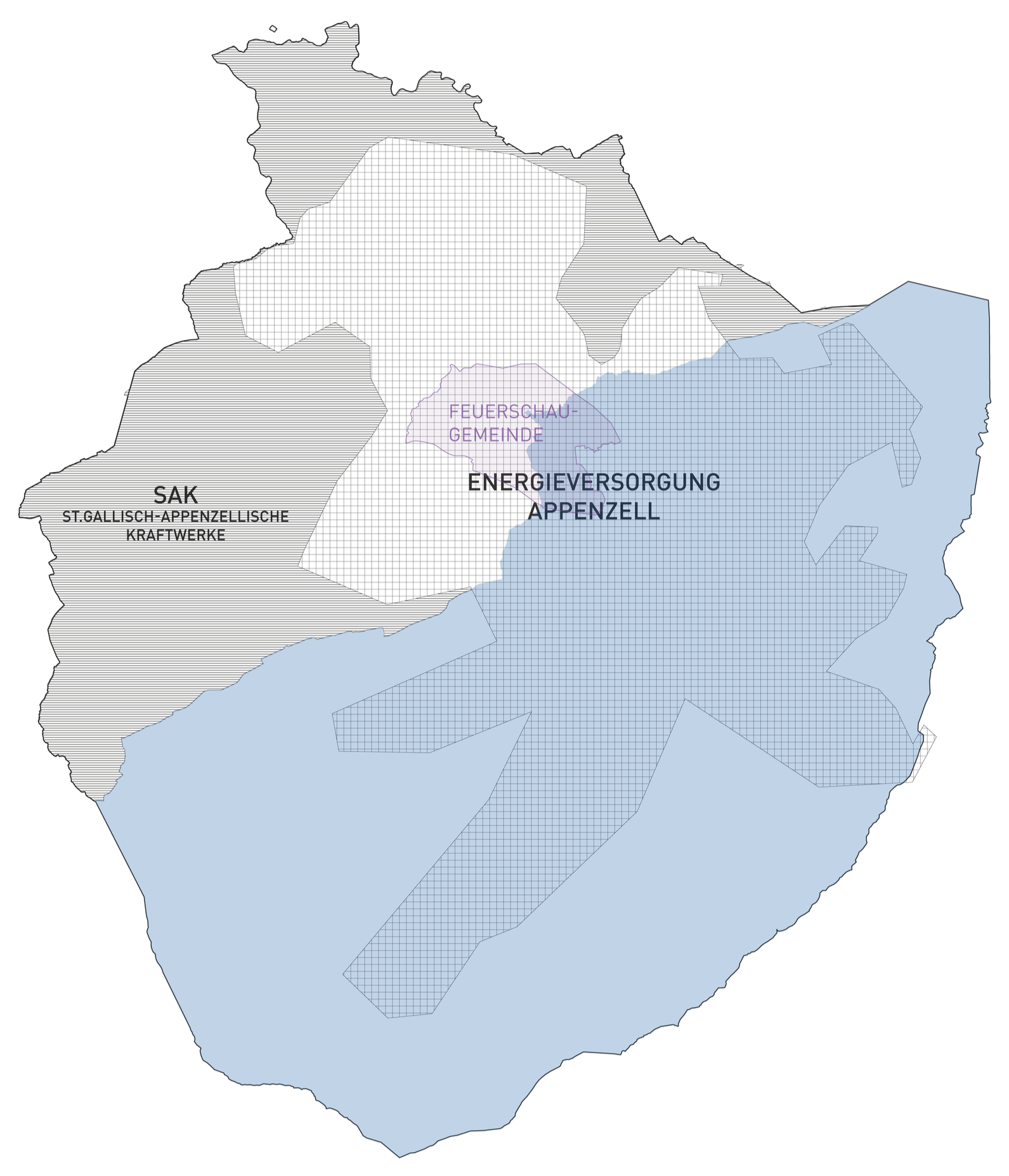 Energieversorgung im inneren Landesteil des Kantons Appenzell Innerrhoden. Blau das Gebiet des Bezirks Schwende-Rüte, violett in der Mitte das Feuerschaugebiet.