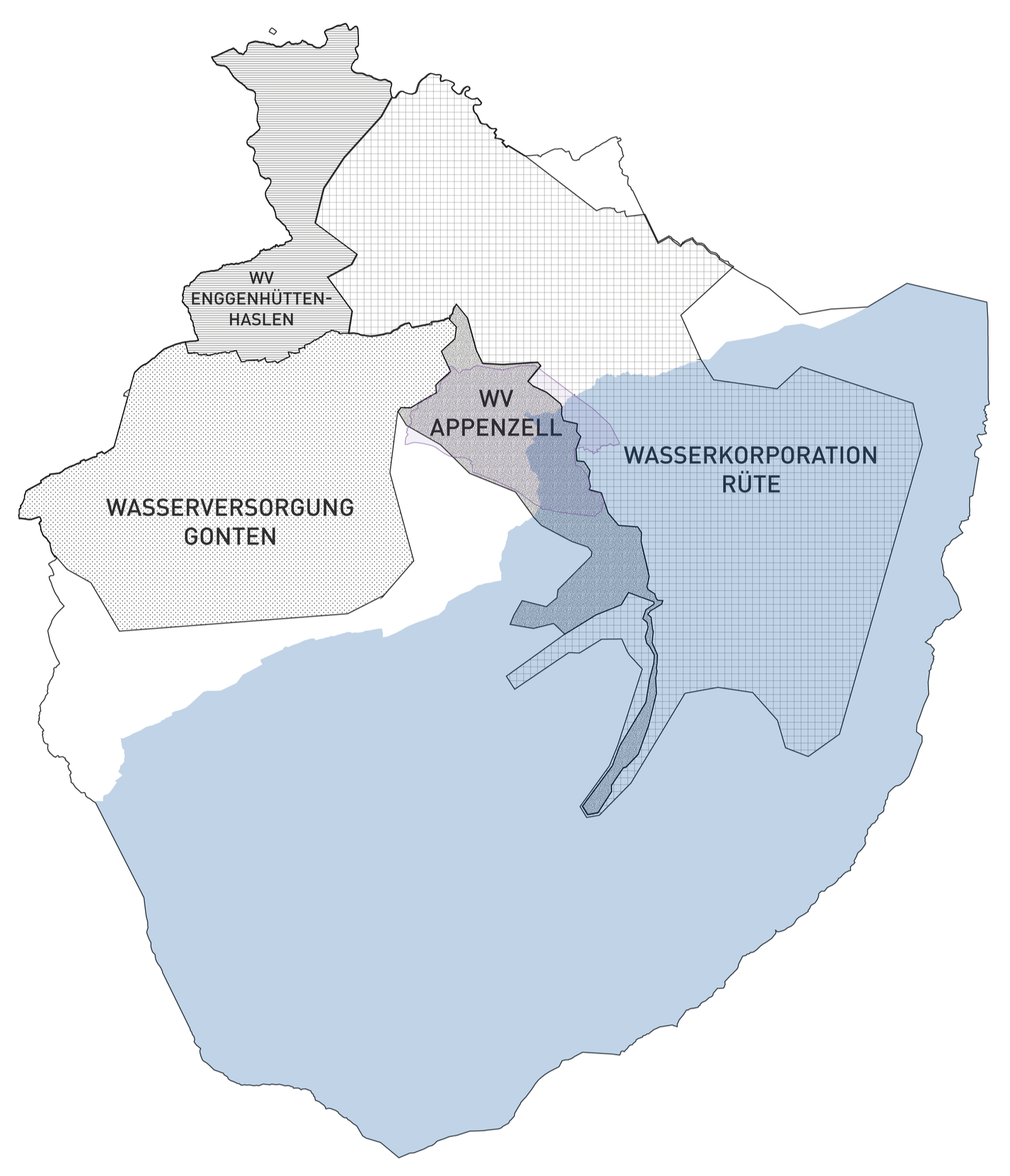 Wasserversorgung im inneren Landesteil des Kantons Appenzell Innerrhoden. Blau das Gebiet des Bezirks Schwende-Rüte, violett in der Mitte das Feuerschaugebiet.